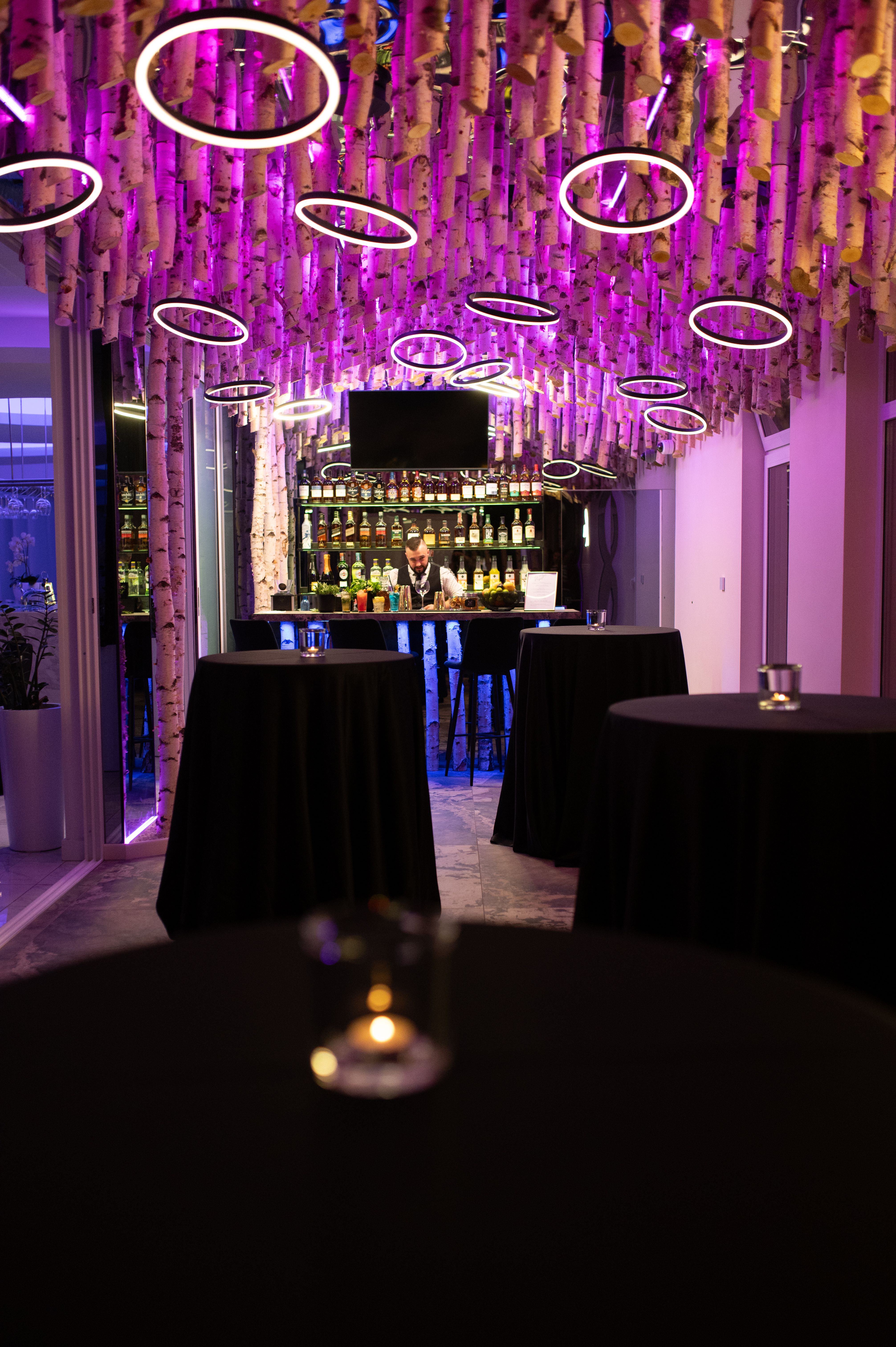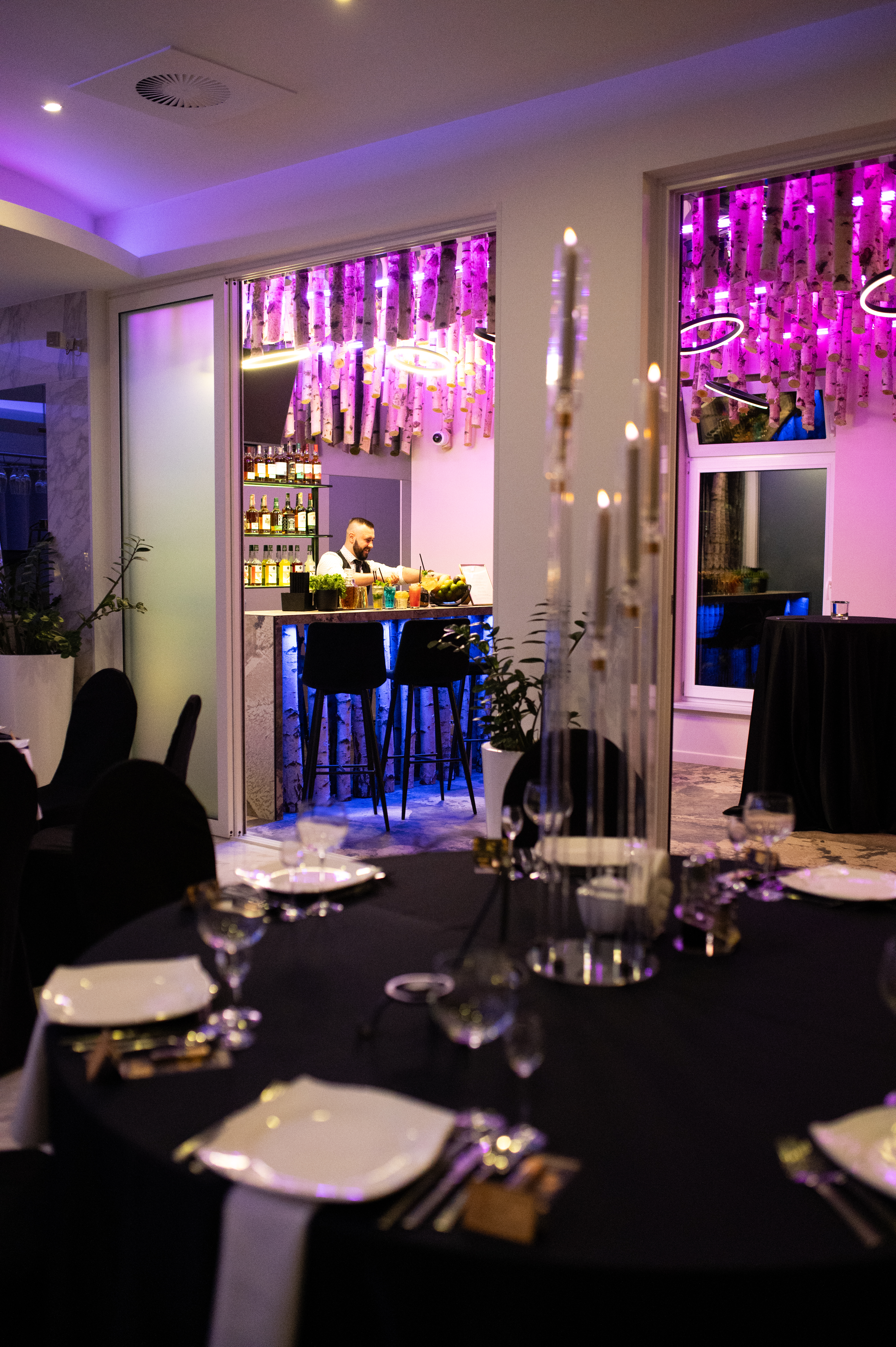 Nowoczesna, kameralna przestrzeń idealna na spotkania w mniejszym gronie – do 24 osób. Oryginalny sufit i ściany z brzozowych pni oraz designerskie oświetlenie tworzą ciepły, elegancki klimat – zarówno za dnia, jak i wieczorem. W centralnej części znajduje się stylowy bar z pełnym wyposażeniem.
