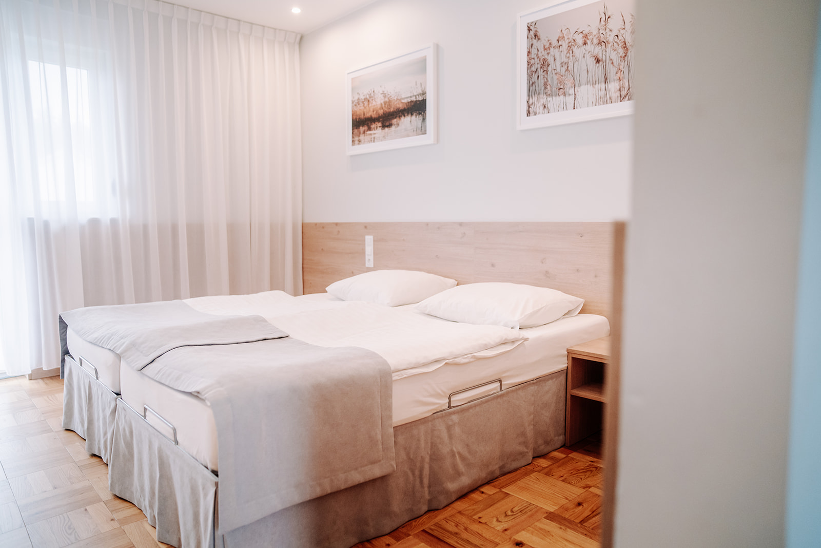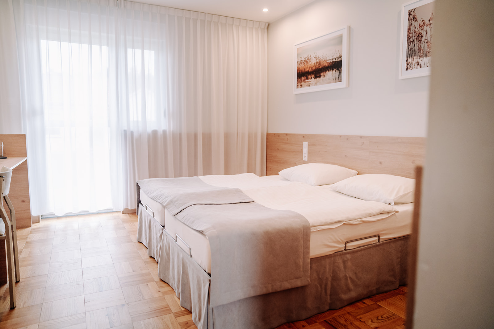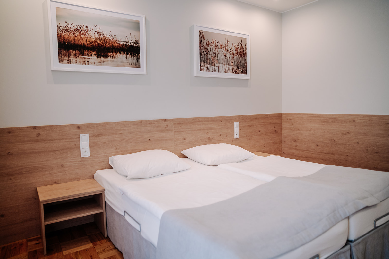 • Pokoje rodzinne 2×2 – ok. 32 m²: dwa pokoje 2-osobowe + wspólny korytarz i łazienka.