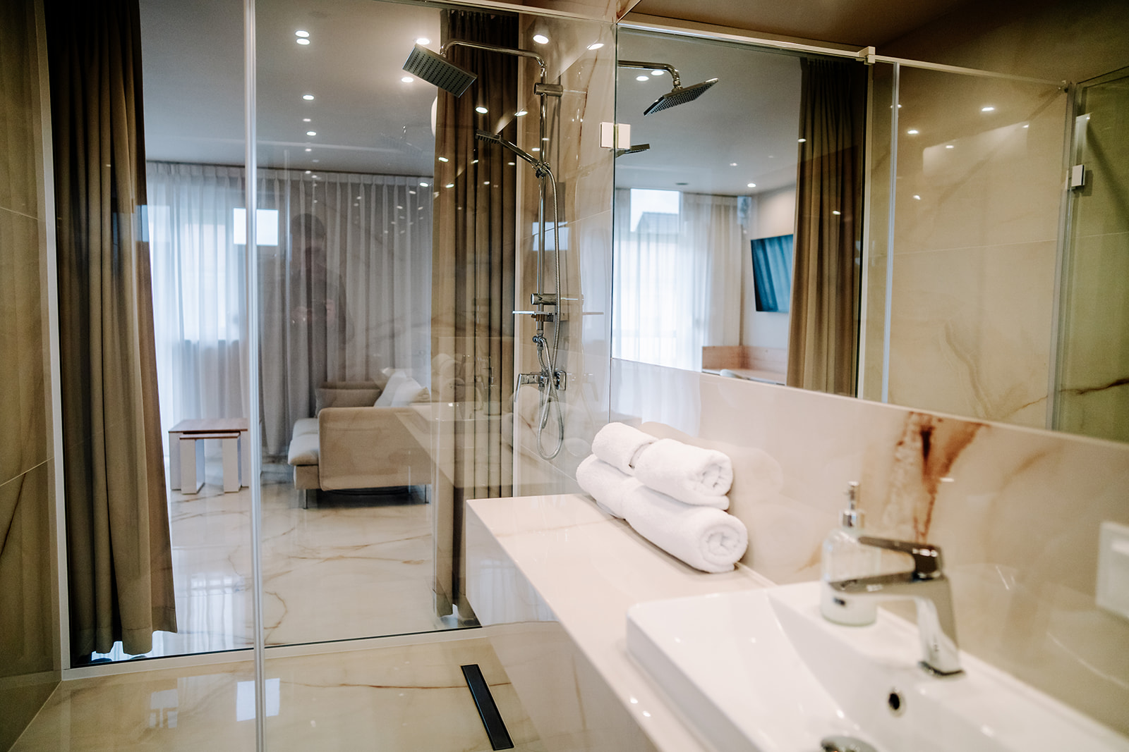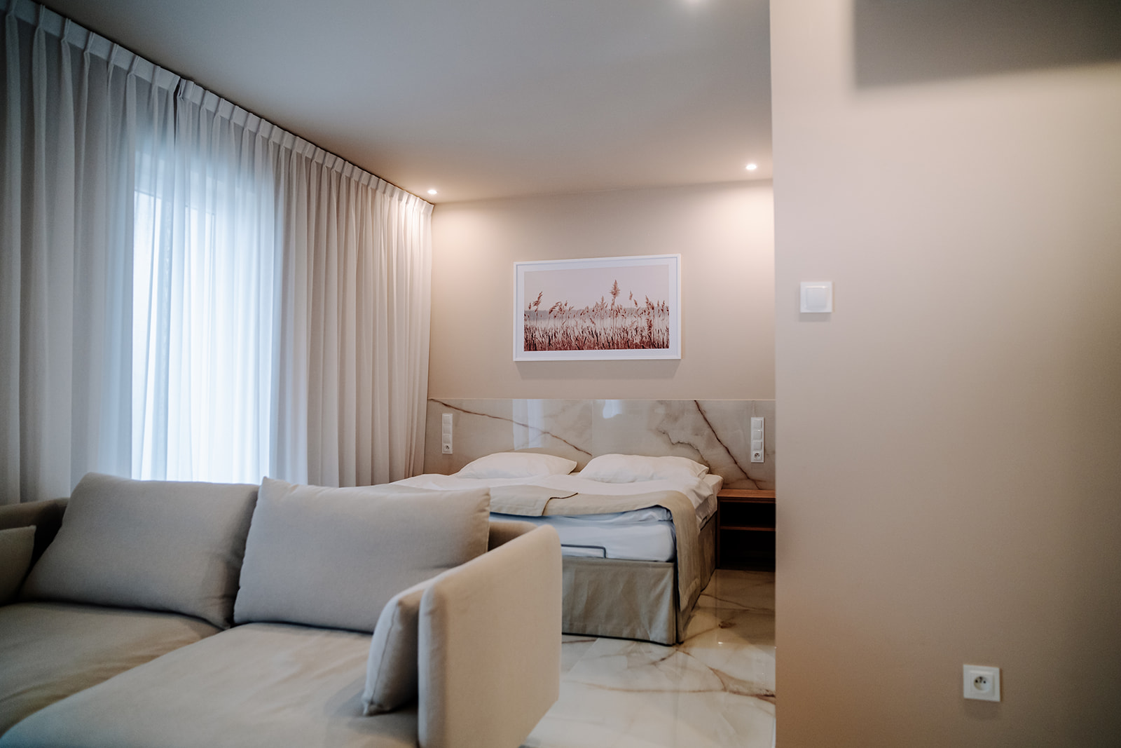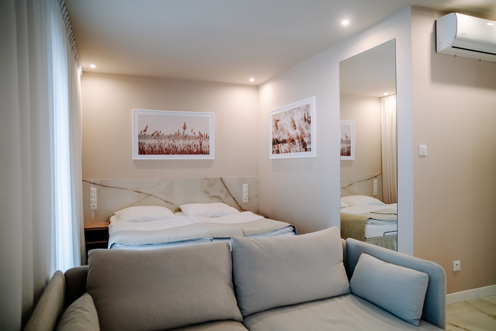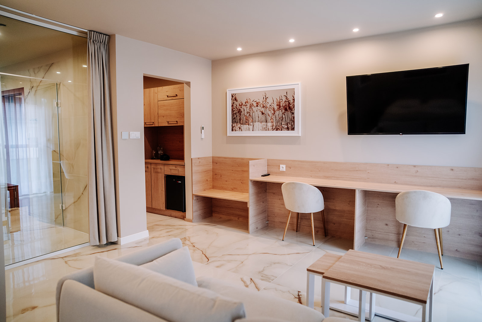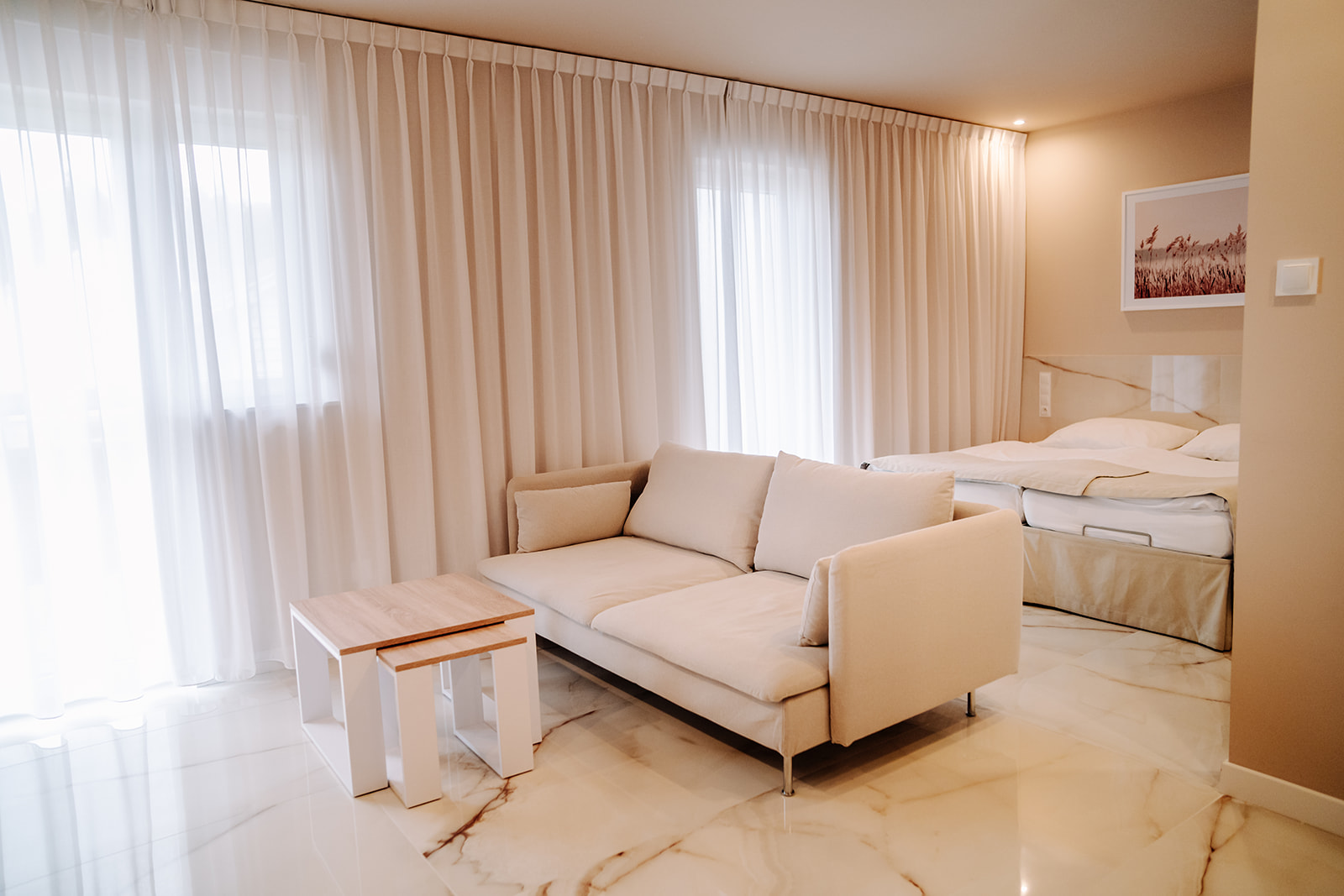 • Pokój typu studio – ok. 35 m², osobna sypialnia, część dzienna i aneks kuchenny.